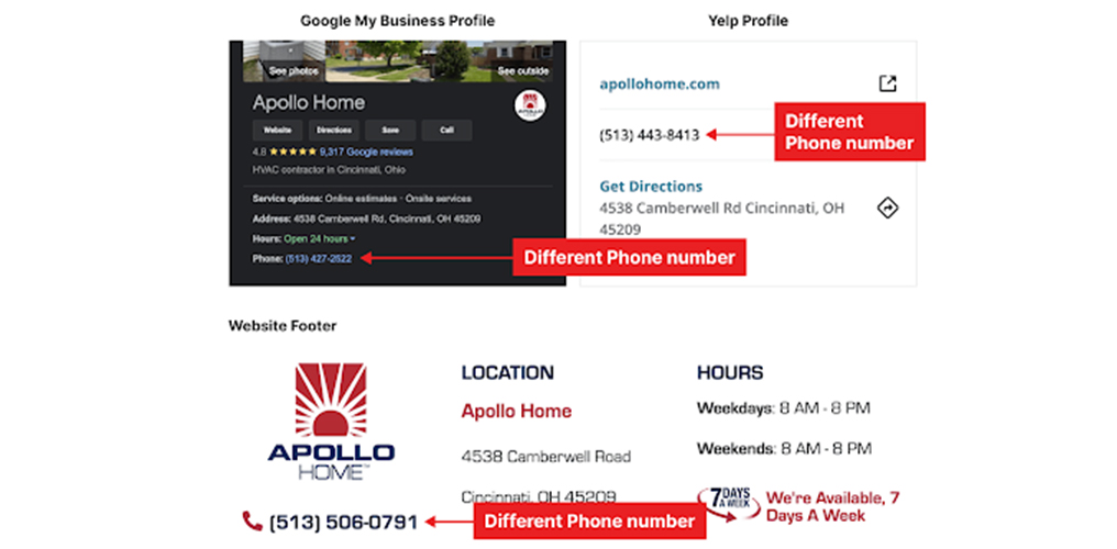Different sources have different phone numbers of the business. The phone number stated on the GBP, Yelp and the company website are all different. Due to the different phone numbers, customers get confusing and misleading information.